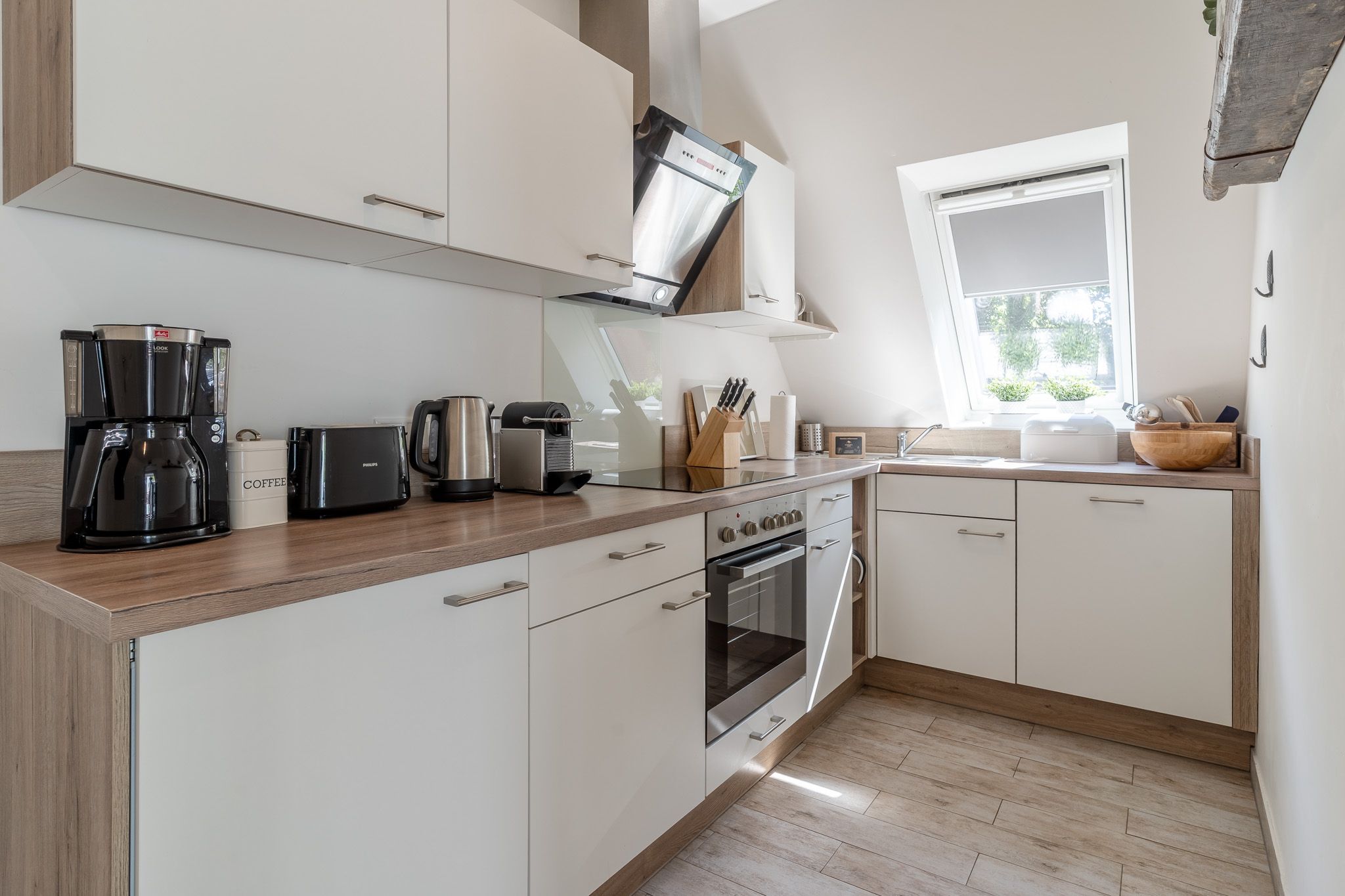 Die Küche ist vollständig ausgestattet und lässt keine Wünsche offen: Ein moderner Herd (Ceran), ein Elektro-Backofen, eine Spülmaschine sowie eine Mikrowelle und Kühlschrank mit Gefrierfach gehören zur Ausstattung. Hier können Sie Ihre Lieblingsgerichte zubereiten. Für zusätzlichen Komfort stehen Ihnen auch Küchenutensilien, Geschirr und Besteck zur Verfügung. Ein Wasserkocher und eine Kaffeemaschine für den perfekten Start in den Tag runden das Angebot ab.