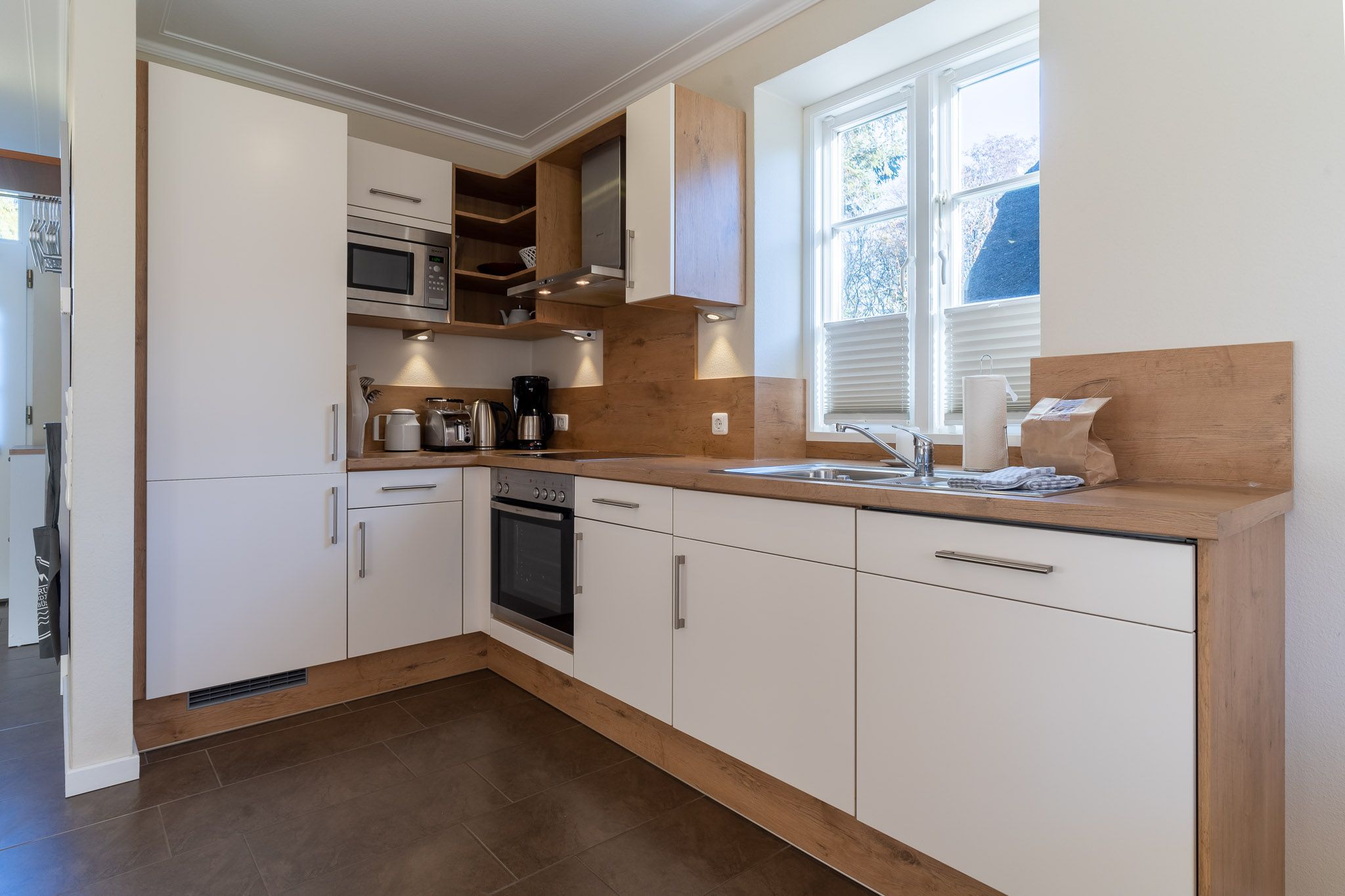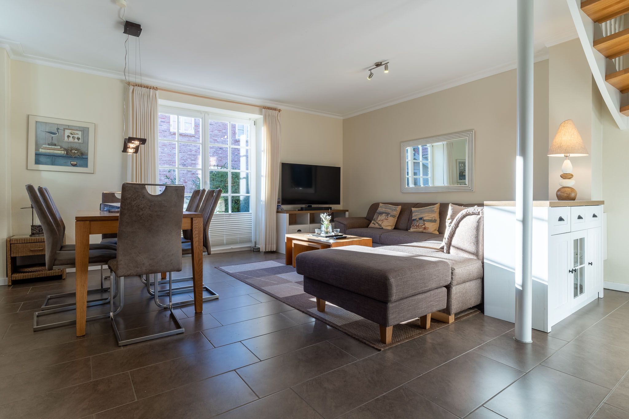 Herzlich willkommen in diesem liebevoll gestalteten Ferienhaus! Auf insgesamt drei Ebenen erstreckt sich eine großzügige Wohnfläche von etwa 95qm, die mit einer durchdachten Raumaufteilung besticht. Der Wohnraum im Erdgeschoss überzeugt mit bodentiefen Fenstern, die für viel Licht und einen wunderschönen Blick in den Garten sorgen. Eine moderne und voll ausgestattete Küche, ein gemütlicher Essbereich und ein bequemes Sofa runden das Angebot ab. Hier können Sie entspannt Ihre Mahlzeiten genießen oder gemeinsam den Abend ausklingen lassen.
