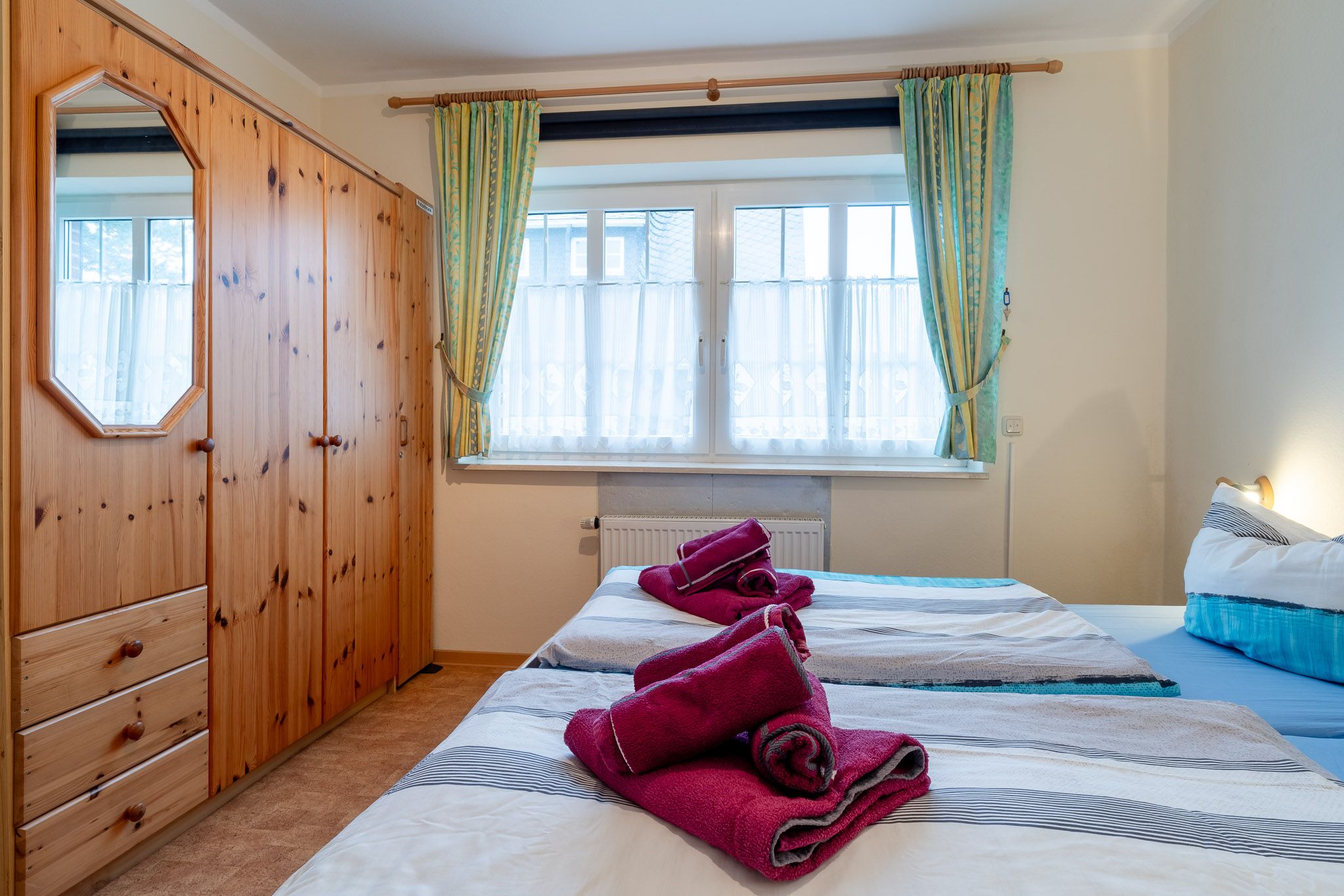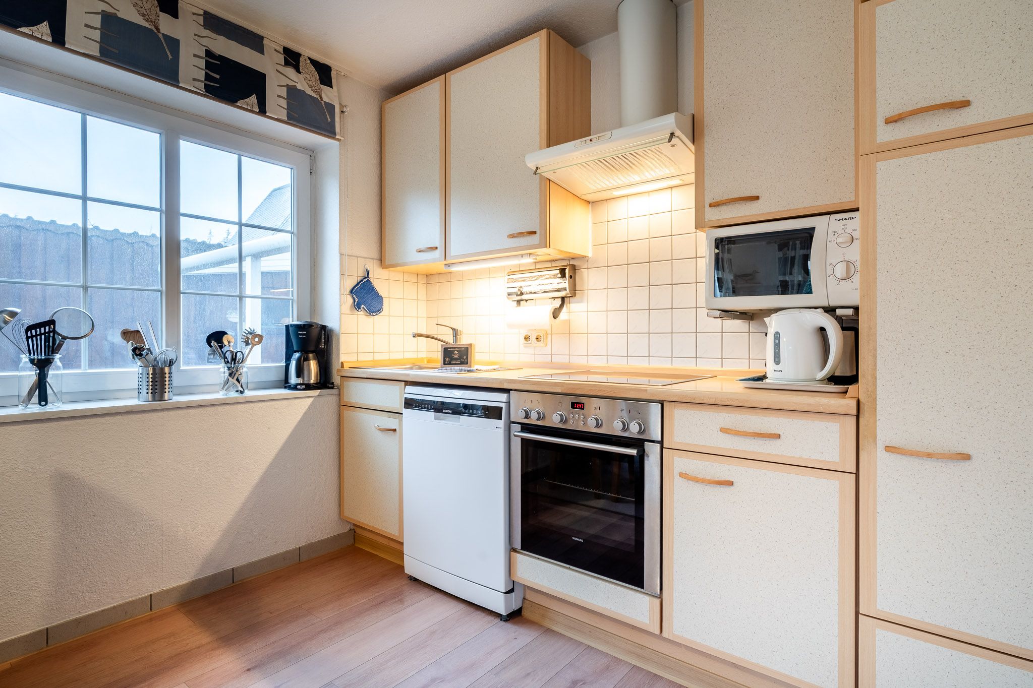 Die Ferienwohnung befindet sich im Erdgeschoss und überzeugt durch eine großzügige Raumaufteilung sowie eine hochwertige und familienfreundliche Ausstattung. Ihnen stehen zwei Schlafzimmer zur Verfügung – ein großes Schlafzimmer mit Doppelbett und Kinderreisebett sowie ein weiteres Schlafzimmer mit zwei Einzelbetten. Zwei Badezimmer sorgen für zusätzlichen Komfort im Urlaub. Der gemütliche Wohnbereich lädt zum Entspannen ein, während die voll ausgestattete Küche mit Backofen, Cerankochfeld, Mikrowelle, Spülmaschine, Kaffeemaschine, Toaster, Waffeleisen und vielen weiteren Haushaltsgeräten keine Wünsche offen lässt.