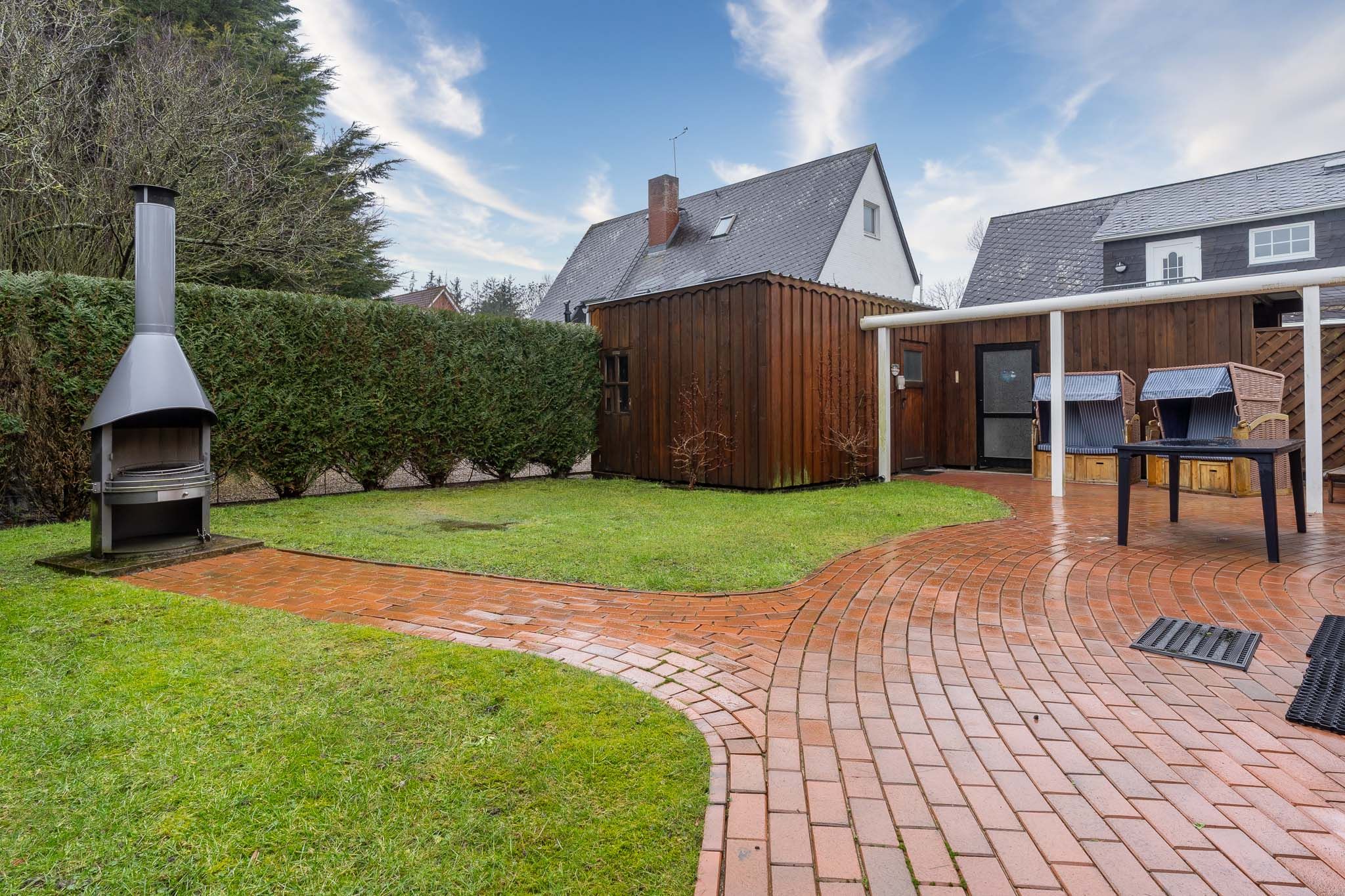 Ein besonderes Highlight dieser Ferienwohnung in St. Peter-Ording ist die etwa 40 m² große Terrasse mit elektrischer Markise sowie der angrenzende Garten mit Gartenmöbeln und Strandkorb. Hier können Sie die frische Nordseeluft genießen, entspannen oder gemütlich grillen. Für Fahrräder steht ein Gartenhaus als Abstellmöglichkeit zur Verfügung. Ein Parkplatz befindet sich direkt am Haus.